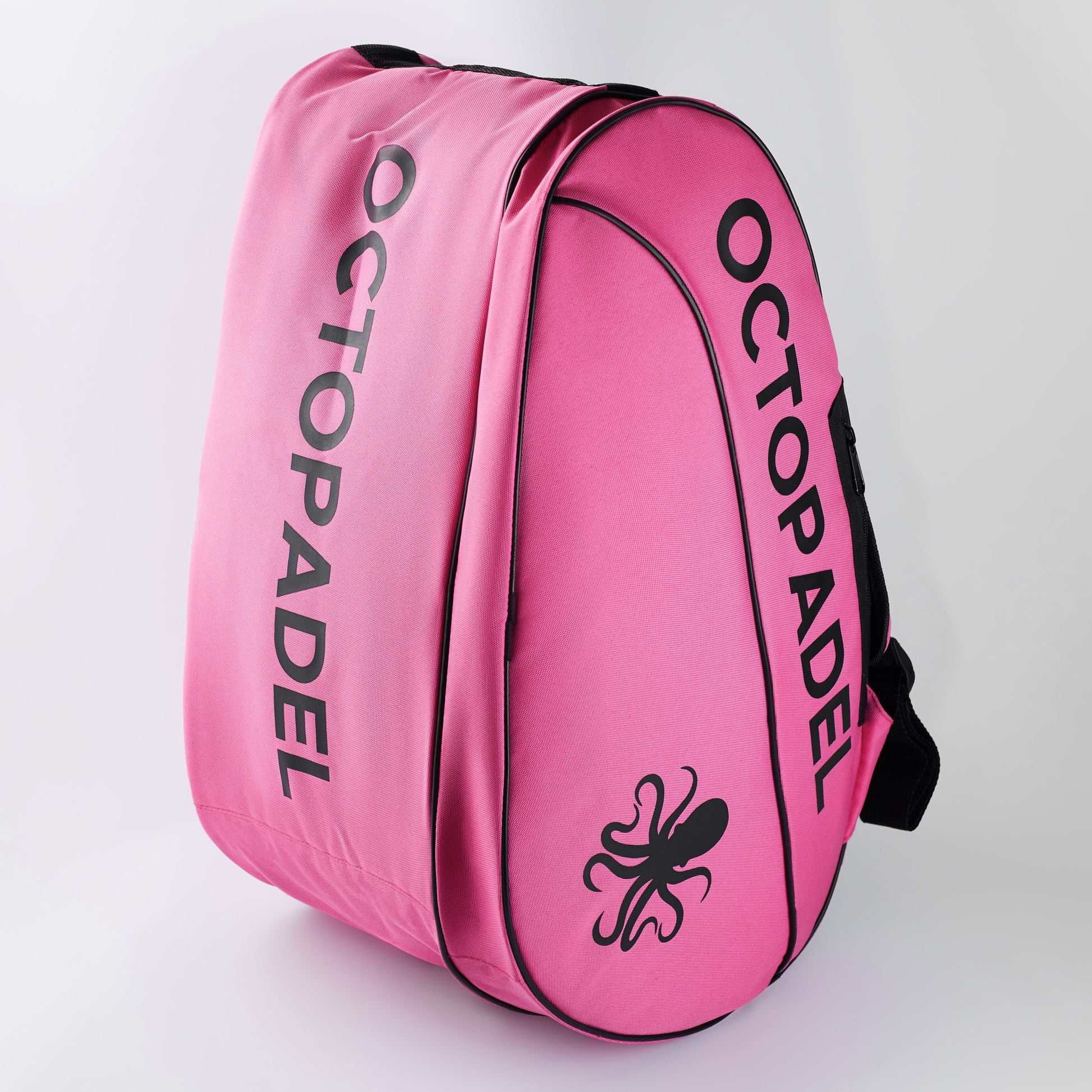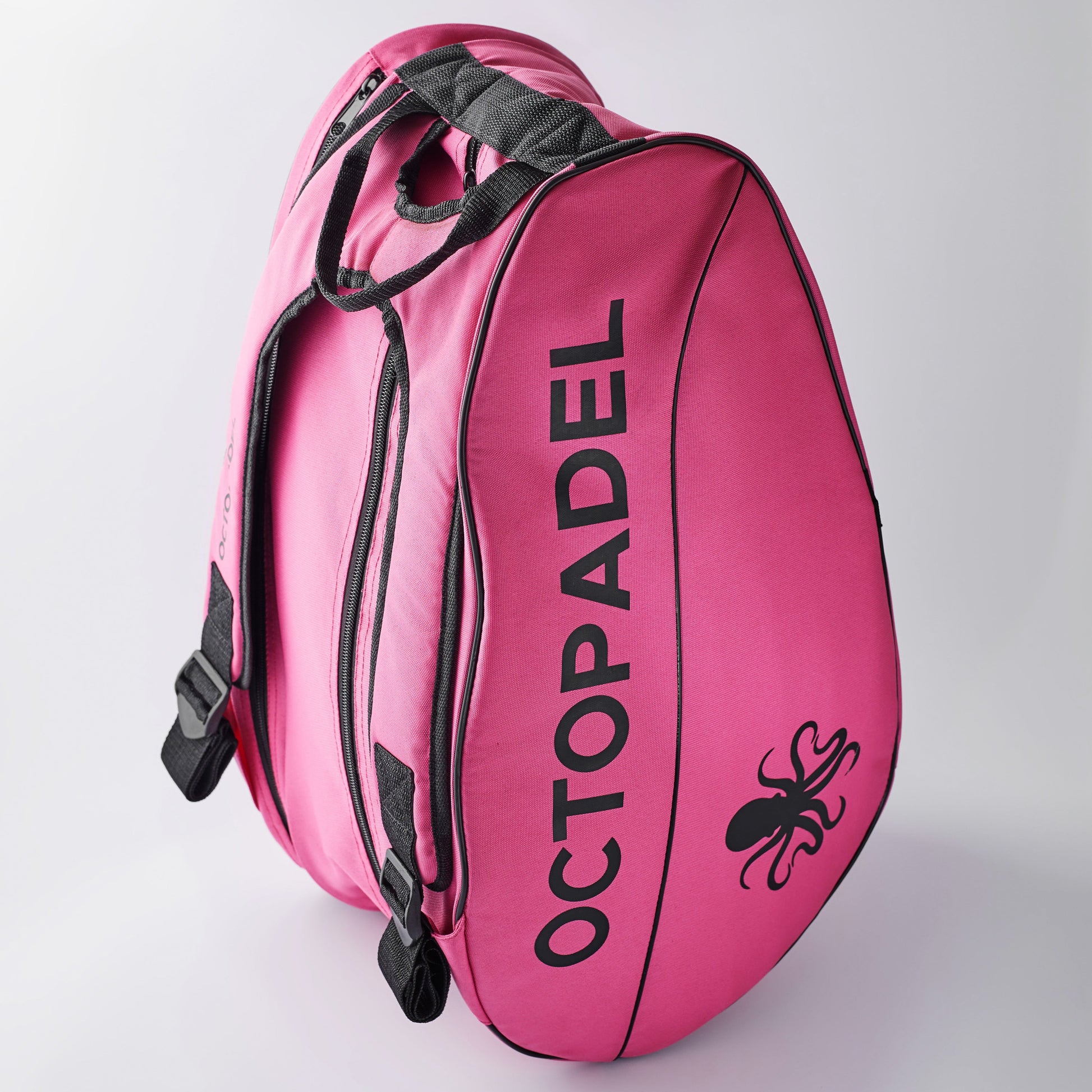 The bag has 3 pockets, a racket pocket on one side to keep your racket safe, a large central pocket to store extra rackets clothes and accessories and a small zipped pocket on the front to hold your phone, keys and money.